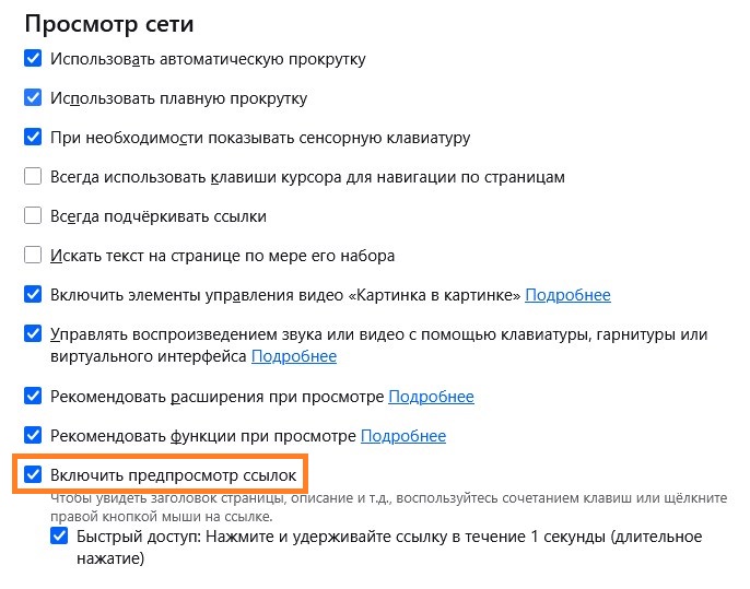 Чтобы отключить предварительный просмотр ссылок, нужно открыть настройки браузера, и в разделе "Основные", найти пункт "Просмотр сети". В нем будет пункт "Включить препросмотр ссылок", у которого необходимо снять галочку.