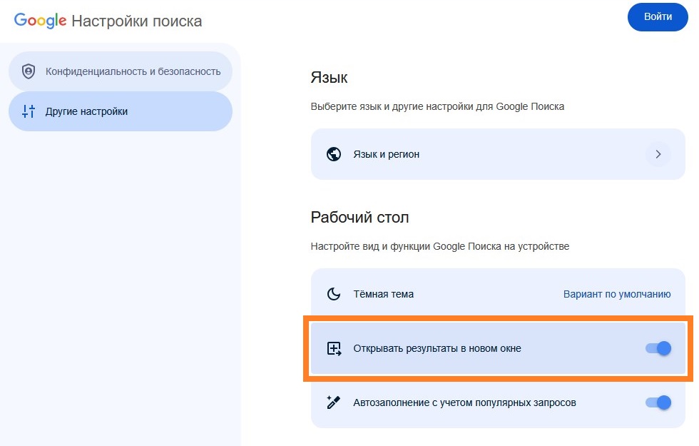 - Теперь нужно на странице с настройками найти пункт "Открывать результаты в новом окне", и переключить его переключатель во включенное положение.