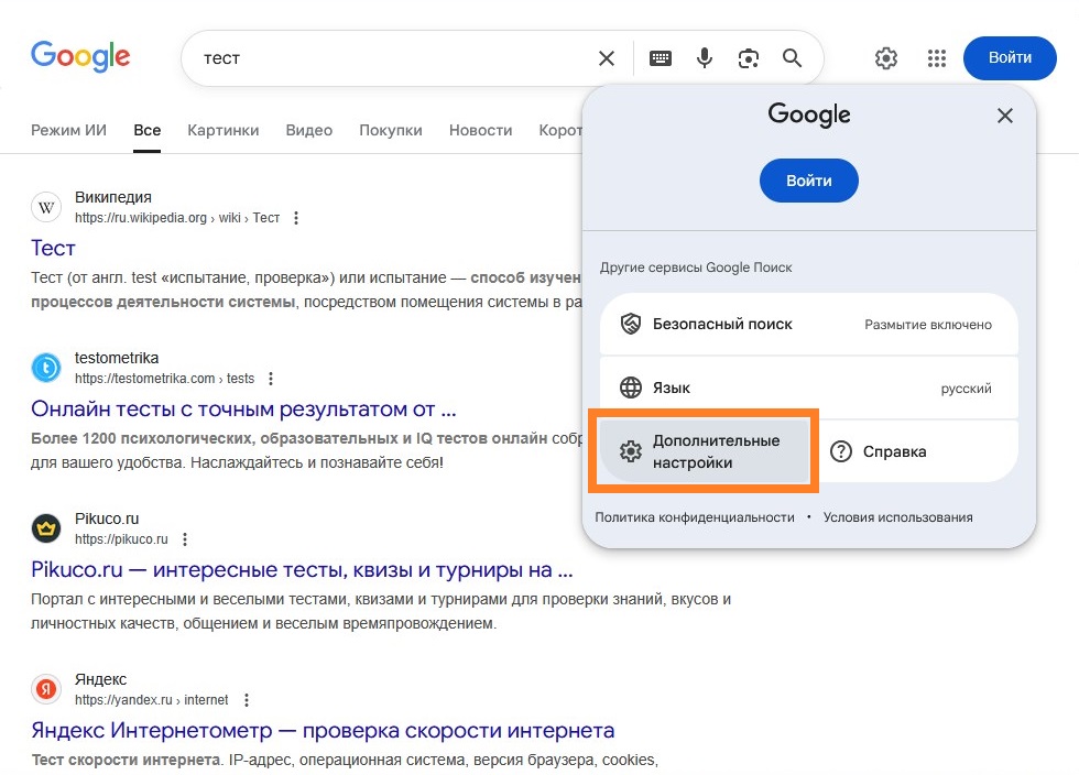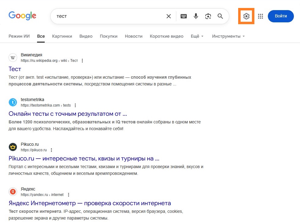 https://www.google.com), и выполнить там любой поисковый запрос. - В самом верху страницы, справа, найти значок шестеренки, который при наведении называется "Быстрые настройки", нажать на него.