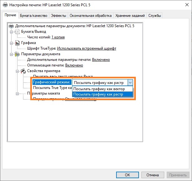 - На вкладке "Прочие" находим пункт "Графический режим", и выбираем значение "Посылать графику как растр".