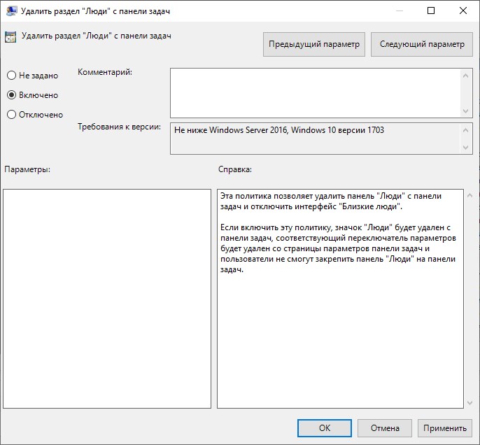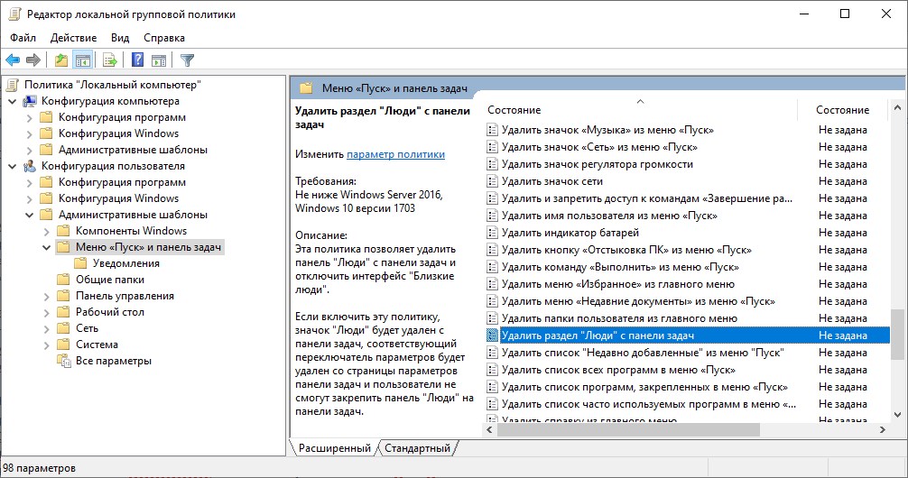 - Находим пункт "Удалить раздел "Люди с панели задач".